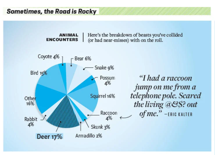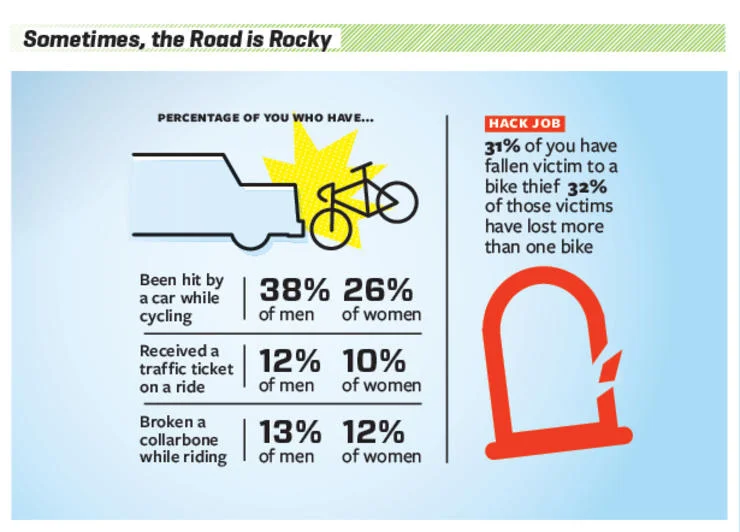 I thought it might be fun to compare my riding style and interests with other riders. I found this Bicycling Magazine Reader's Choice Poll and thought it had some entertaining info graphics. The article was published in 2014, but I couldn't find a more recent poll that was equally interested. I doubt we've changed that much since then. Where do you fit in?